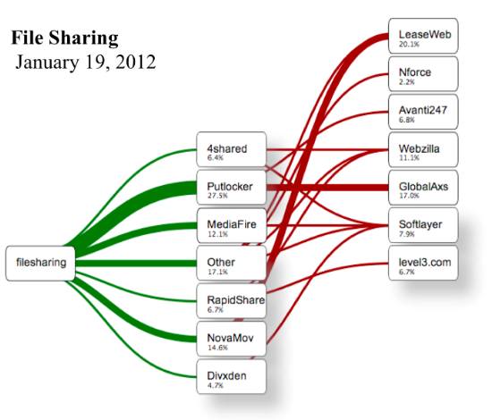 Benché nelle ore successive alla chiusura di quest’ultimo sia stato registrato un crollo del 3% nel volume di traffico Internet a livello globale, insomma, l’assenza del più importante nome nel campo del file sharing non sembrerebbe rappresentare una minaccia per l’intero settore. Secondo il report di DeepField, infatti, l’operazione coordinata delle autorità di Stati Uniti e Nuova Zelanda ha avuto come conseguenza un semplice riassetto delle gerarchie, con 6 servizi che detengono ad oggi circa il 75% dell’intero traffico legato alla condivisione di file online. Trattasi di nomi quali 4shared, Putlocker, MediaFire, RapidShare, NovaMov e Divxden.
